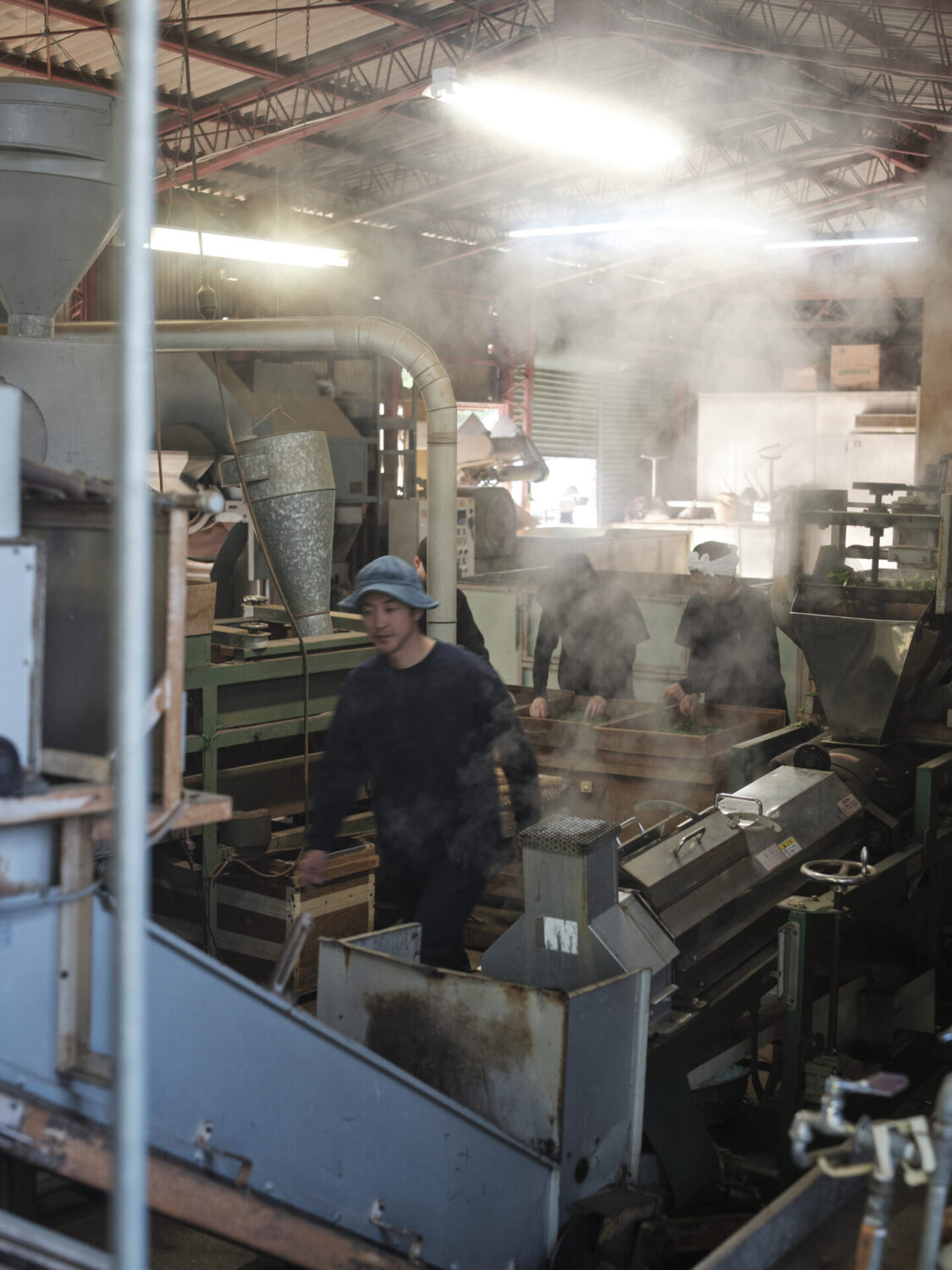 煎茶づくりは茶葉を摘んだその日に仕上げる(荒茶まで)。滞在中も毎晩遅くまで作業がつづいていた。[TEA BUCKS]の3人は茶工場の2階に寝泊まりして、夢の中でもお茶の香りを感じていたに違いない。