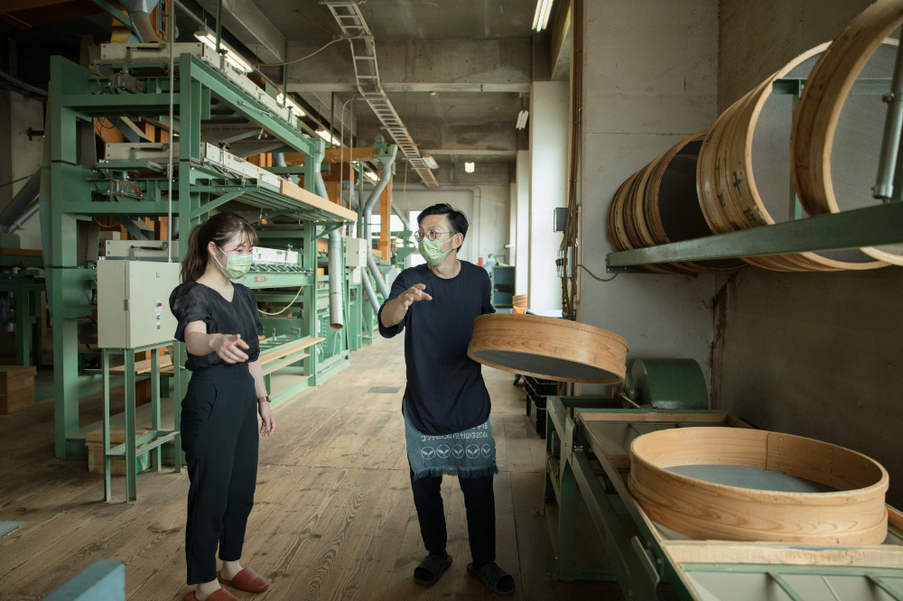 [茶屋すずわ]から歩いてちょうど5分、同じ静岡市葵区に工場を構える[和田長治商店]に到着する。瓦屋根が目を引く建物に入ると、天井に吊るされた篩が目に入ってきた。